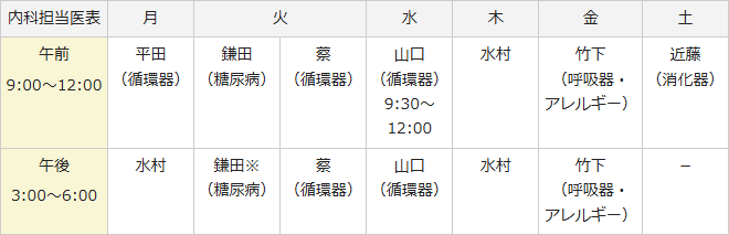 | 呼吸器科 | 金曜日 午前・午後 | 呼吸器疾患、気管支喘息、慢性閉塞性肺疾患、COPD、慢性のせき、肺炎、インフルエンザなどの呼吸器感染症など |